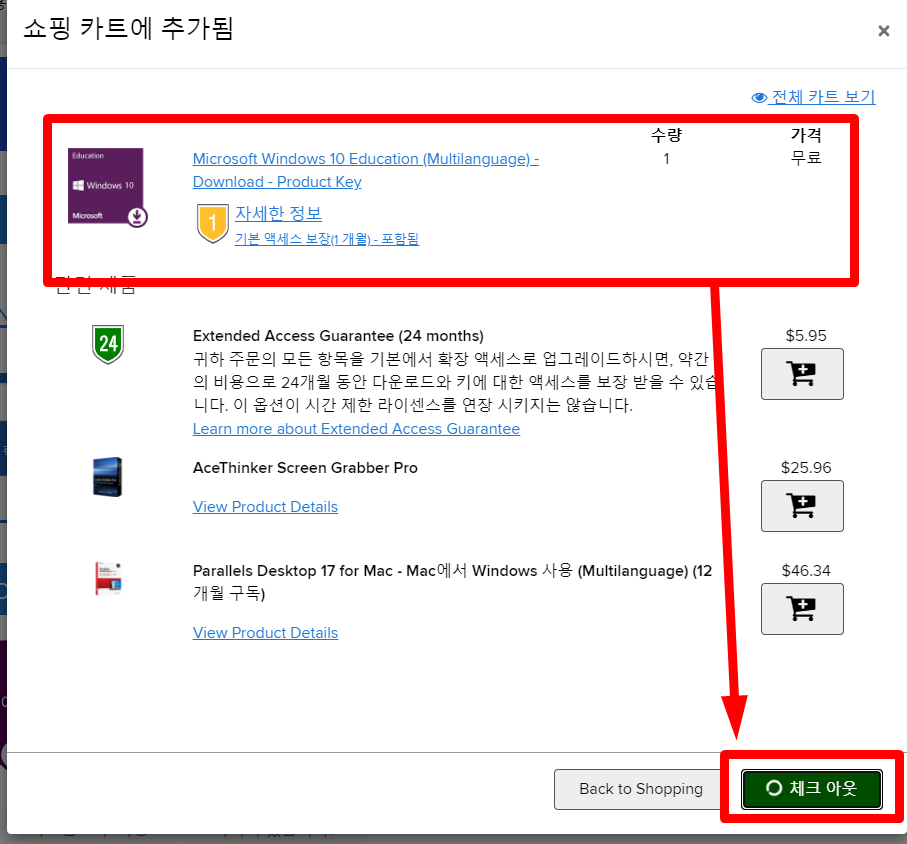 쇼핑 카트에 추가하고, 팝업창의 체크아웃을 클릭.