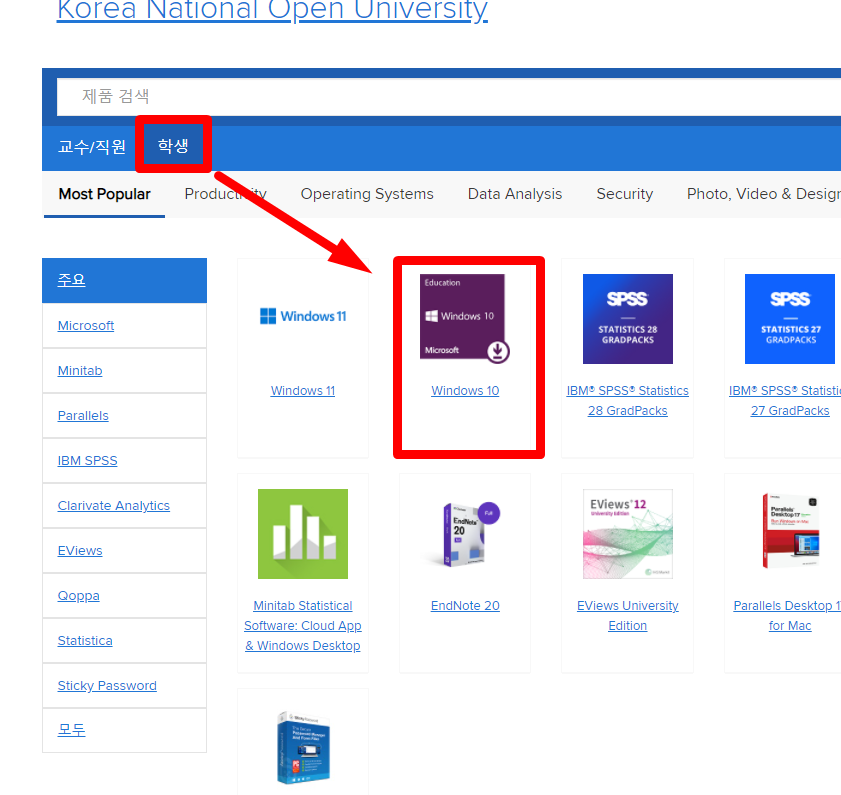 '학생' 탭에서 윈도우10을 선택한다.