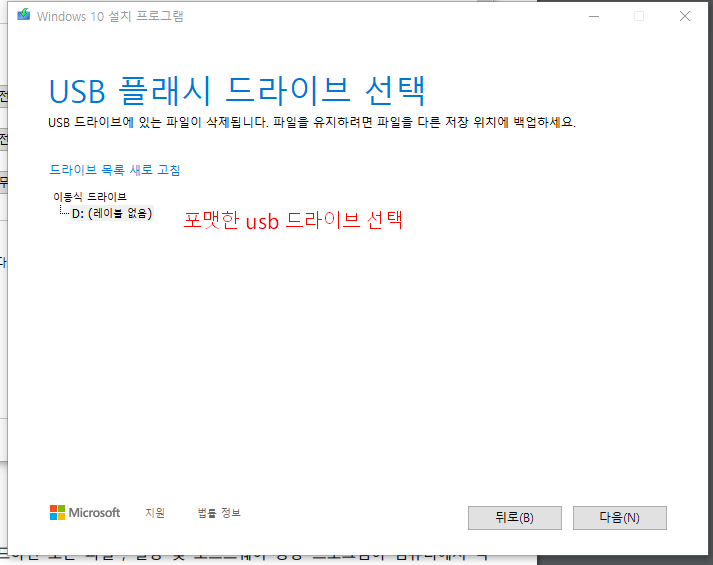 포맷한 usb 드라이브를 선택하고 다음 클릭.