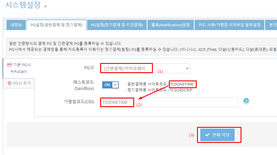 테스트 모드를 ON으로 설정하고, 가맹점 코드(CID)에 TC0ONETIME 를 입력한다.
