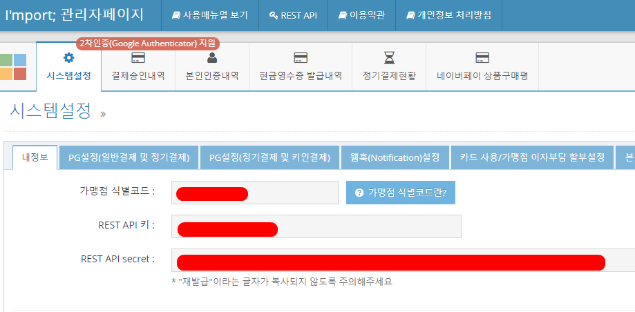 REST API 키와 REST API secret는 서버에서 아임포트 API를 연동할 때 필요한 설정 값이다.