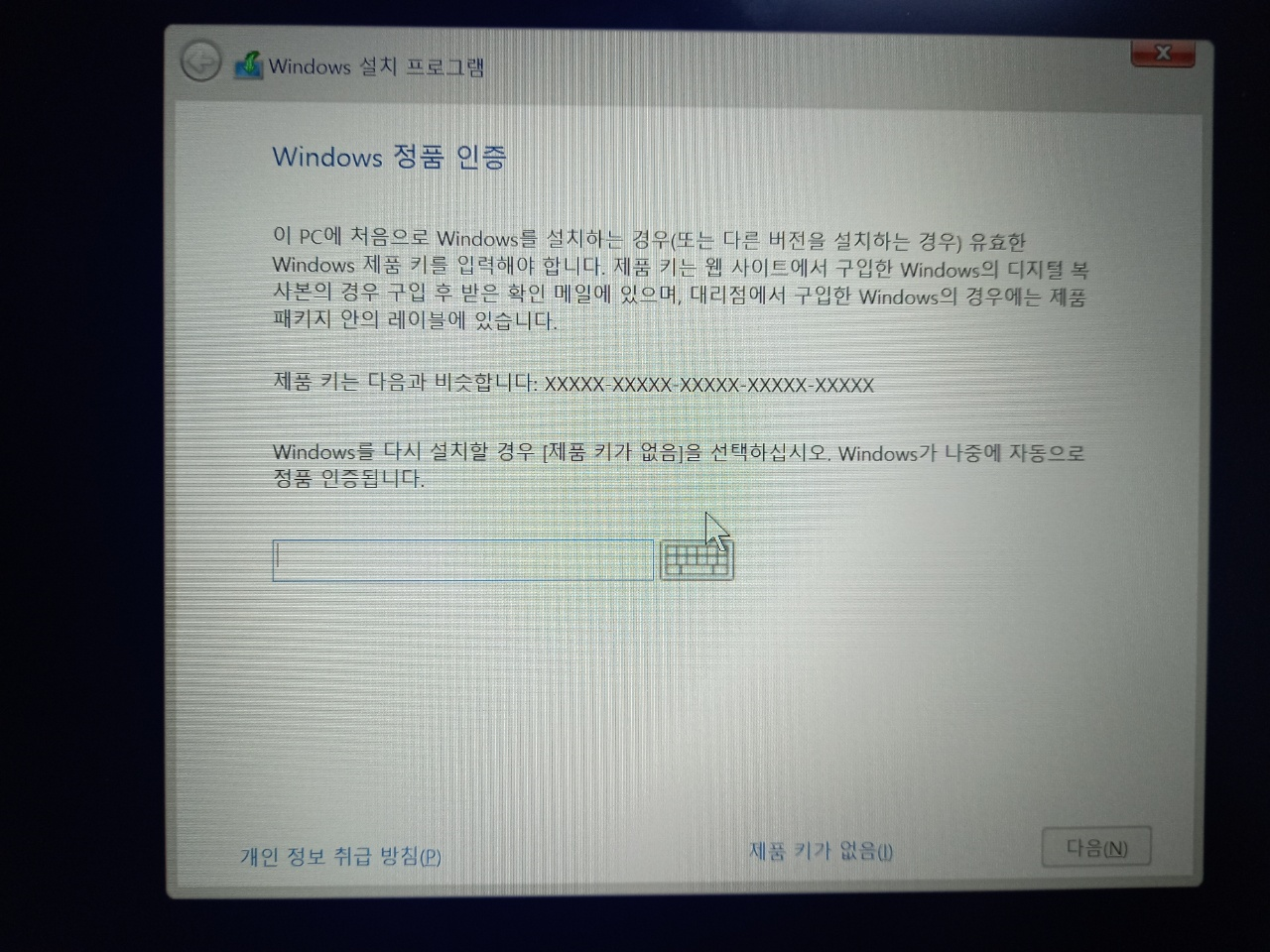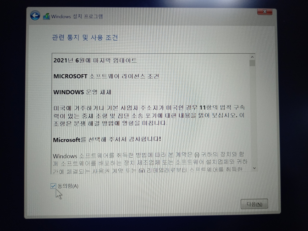 제품키를 등록하고 관련 통지 및 사용 조건에서 동의함 체크 후 다음 버튼을 클릭