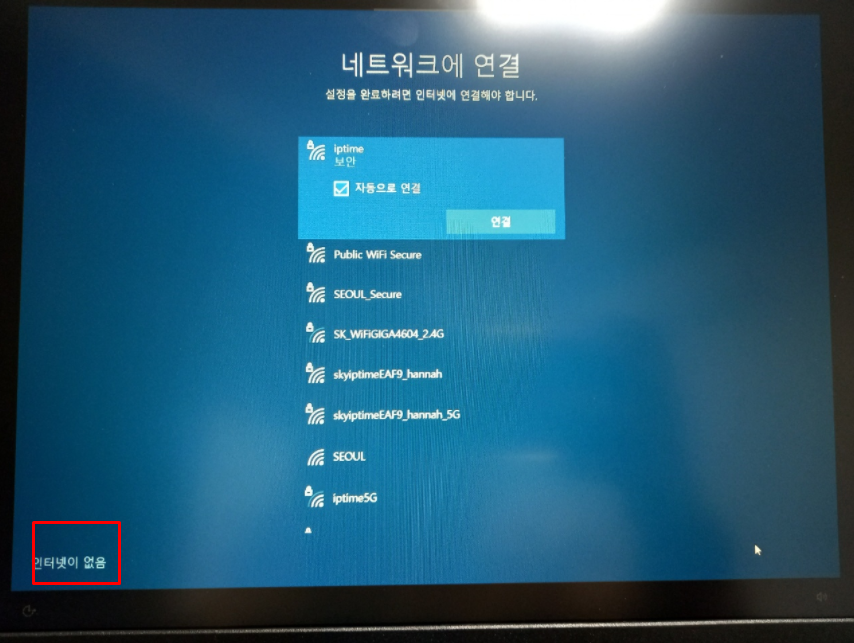 네트워크 연결은 [인터넷이 없음] 선택