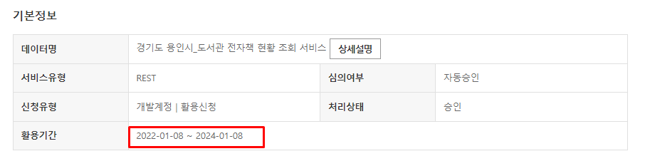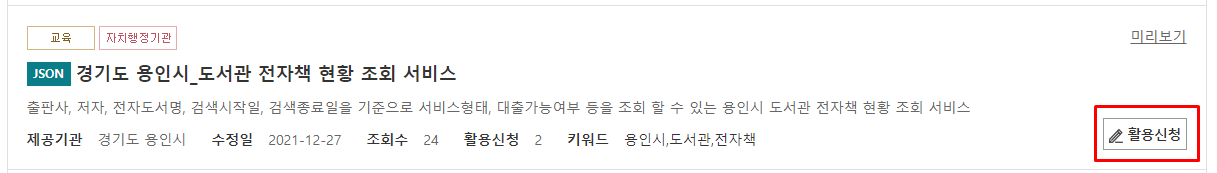 '경기도 용인시_도서관 전자책 현황 조회 서비스' 를 선택해 [활용신청]를 클릭해 보았다.