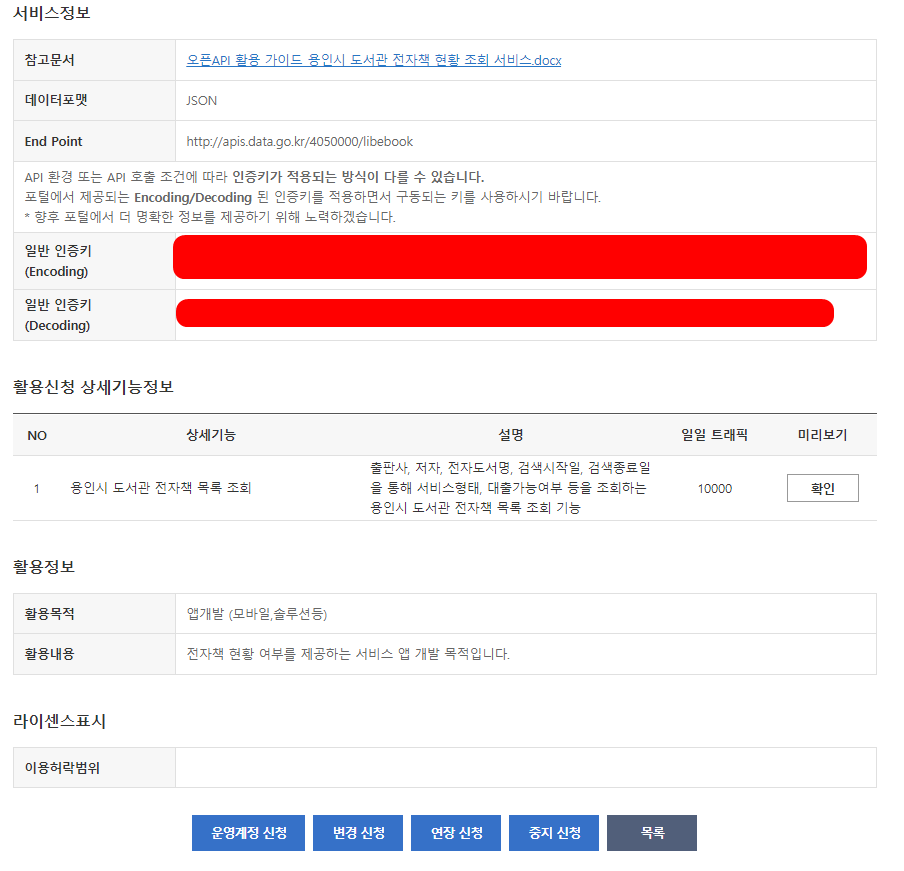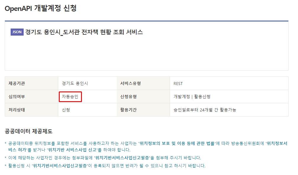 이 API의 심의여부는 자동승인이지만, 많은 API들은 신청 시 심의 기간이 좀 필요한 것 같다.