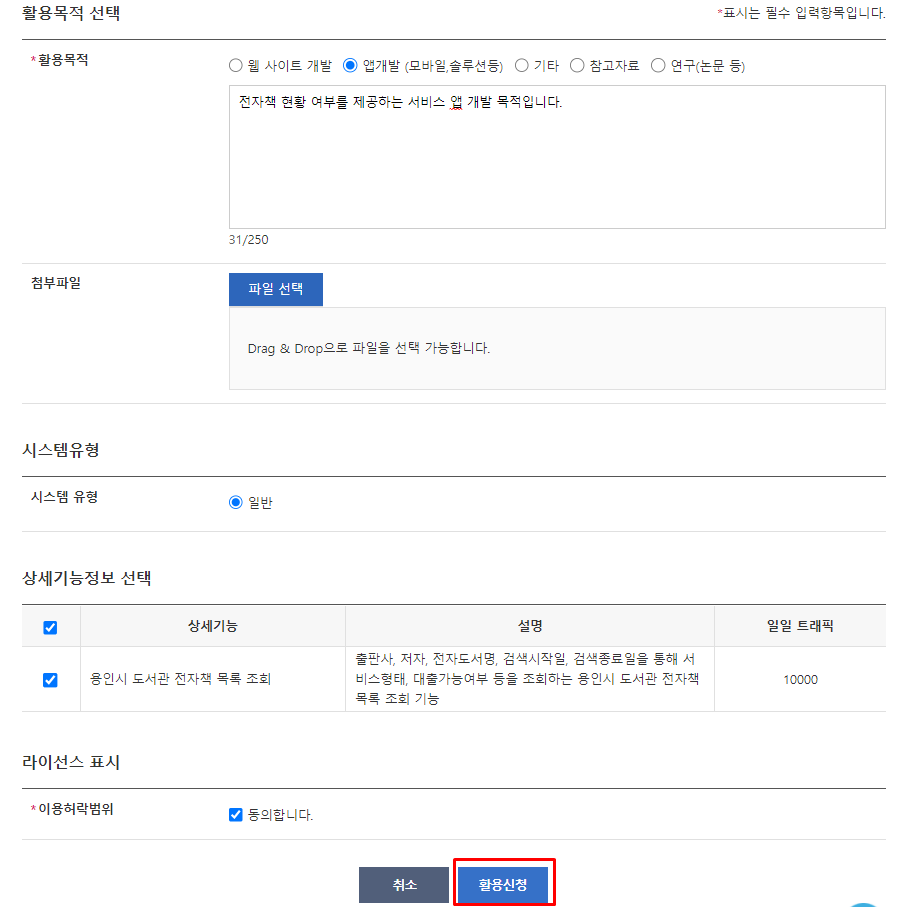 활용 신청서를 작성하고 [활용신청] 클릭