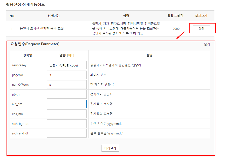 여기서 미리보기를 클릭하면 API를 테스트 확인해볼 수 있다.