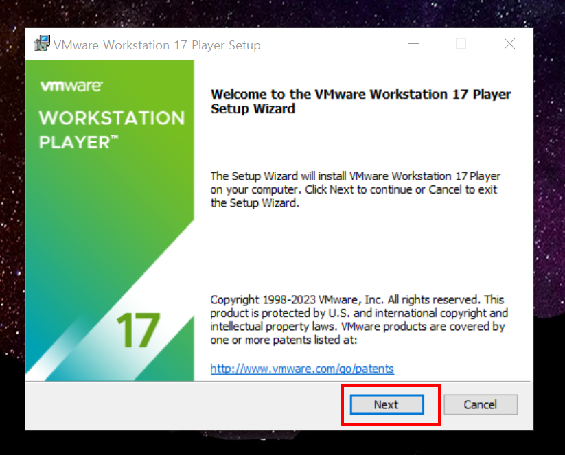 다운받은 가상머신 Vmware workstation Player를 설치합니다. (VMware-player-full-17.0.2-21581411)