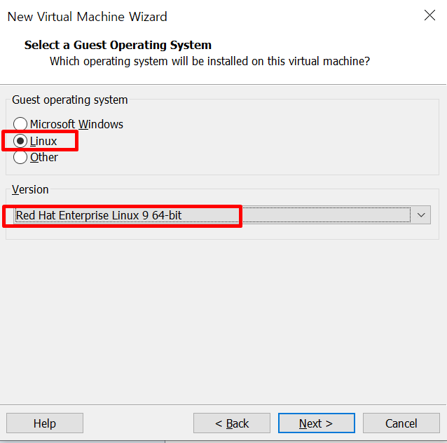 종류는 linux, 버전은 Red Hat Enterprise Linux 9 64-bit 를 선택합니다.
