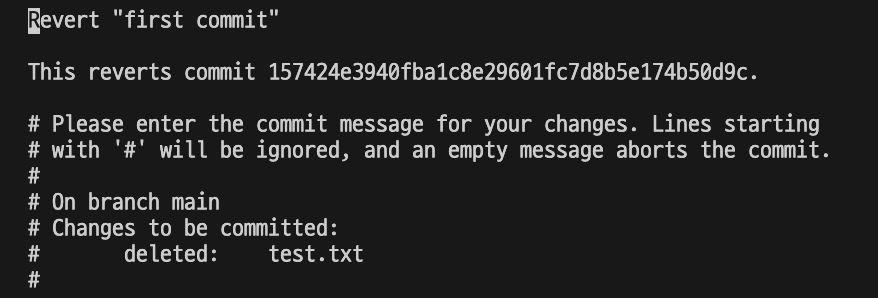 git log로 조회된 해시값을 이용해 ‘first commit’을 revert 합니다