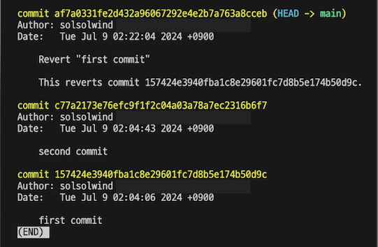 git log 명령어를 이용해서 commit 목록을 확인해보면 새로운 revert 커밋이 하나 추가되어 있습니다.