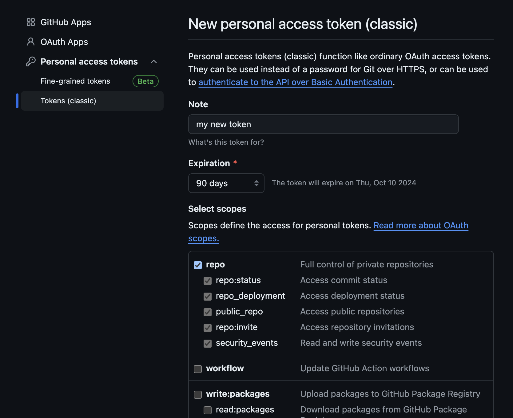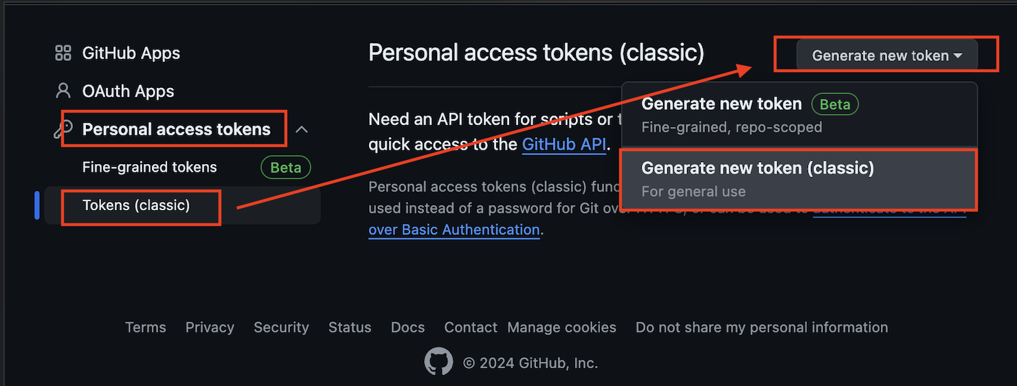 [Personal access tokens > Tokens (classic) > Generate new token (classic)] 클릭