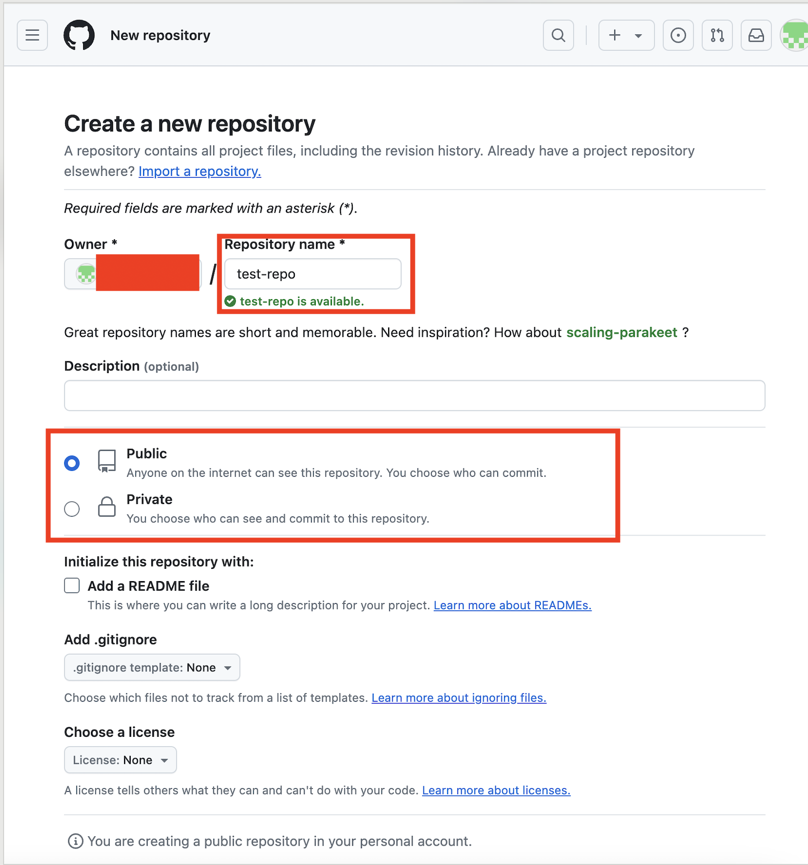 private은 해당 repo를 비공개로 설정합니다. 볼 수 있는 사람과 커밋할 수 있는 사람을 제한할 수 있습니다.