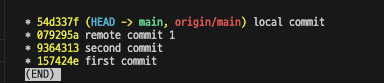 왼쪽에 직선 버전이 local main, 초록색으로 분기가 생긴 모양이 원격 main입니다.