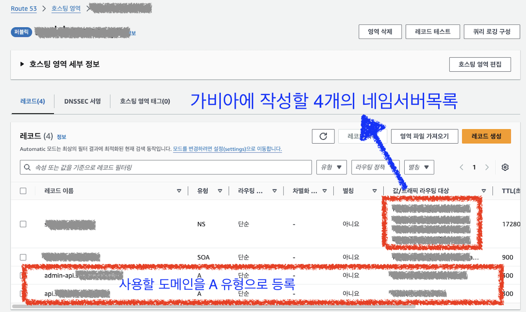 - Route 53에서 생성된 네임서버(NS) 목록을 복사하여 가비아의 네임서버 등록