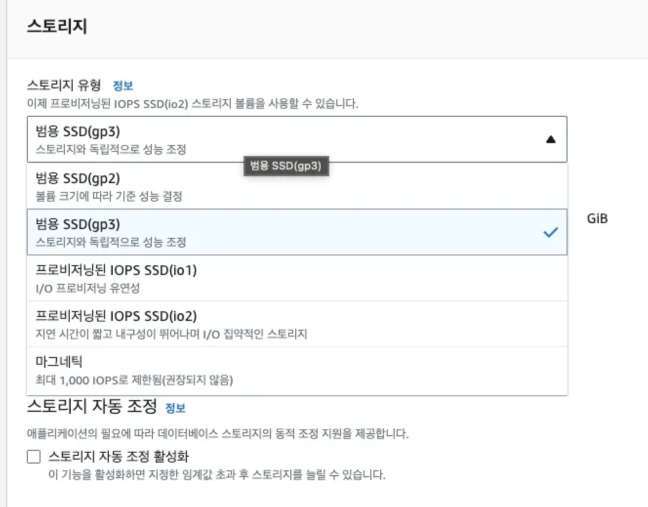 내가 생성할 때는 기본 스토리지 설정이 GP3로 체크되어있기 때문에 설정을 바꿔줘야하는 것으로 보인다.