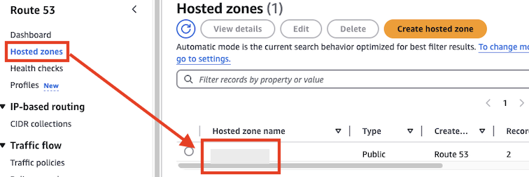 [Route 53 > Hosted zones]에서 구매한 도메인을 선택합니다.